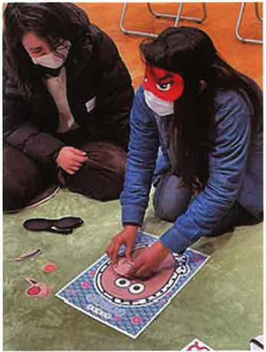 会場の菊池市中央公民館では、1月の「日本語カフェ」のテーマ「お正月を遊ぼう」に則り、和食や正月の風習を紹介した絵本、“羽子板”や“福笑い”などの伝統的な遊びなどが用意されていました。参加者は外国人の質問に答えたり、昔懐かしい遊びに興じたりして、外国人との親睦はもとより日本人同士の交流も深まっていました。また、参加者に“ぜんざい”が振る舞われました。