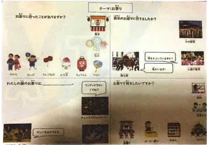 次に、先生はにこやかに日本の祭りについて話します。「あなたの国ではどんな祭りがありますか?」とか質問や感想も交えてすすみます。